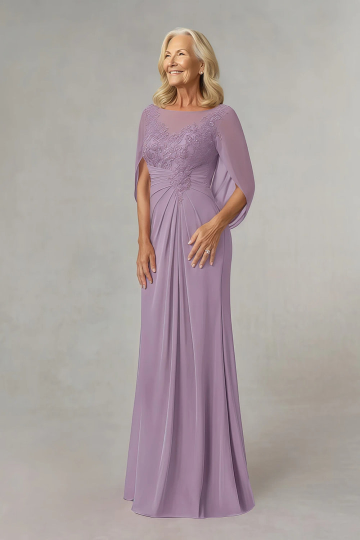 - Illusion Neckline & Cape Sleeves: The illusion neckline mother of the bride dresses-inspired design adds a hint of allure with sheer tulle framing the décolletage and back. Soft, flowing cape sleeves drape from the shoulders, creating an elegant silhouette that enhances movement—whether you’re greeting guests or dancing the night away. This lace mother of the bride dressdetail balances modesty and modernity seamlessly.
