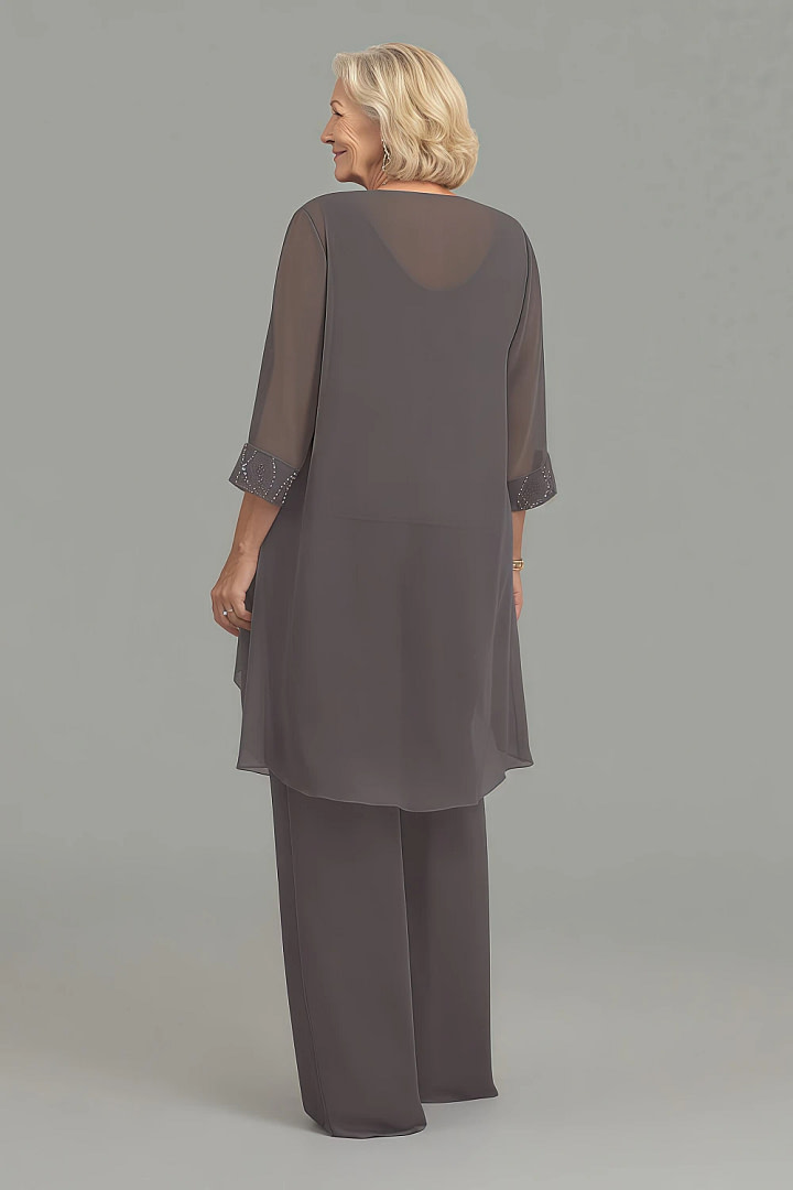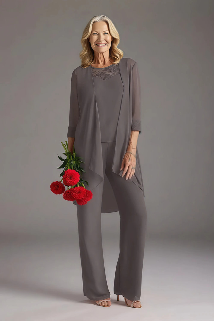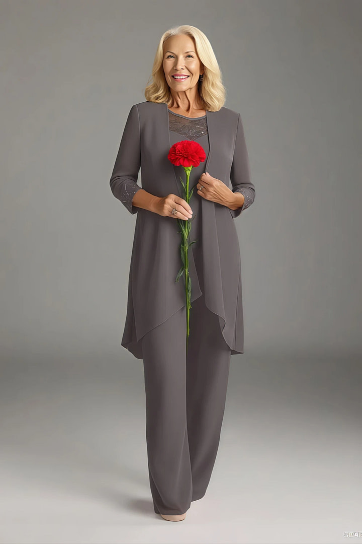 Meet the Akaks adriana dark grey mother of the bride dress 3 4 sleeve pant suits—a refined three-piece ensemble designed to make the mother of the bride or groom radiate understated luxury with a modern edge. Crafted from buttery-soft chiffon in a rich, moody dark grey, this set balances elegant practicality with sophisticated style, making it ideal for weddings that bridge seasons or call for a touch of understated drama.