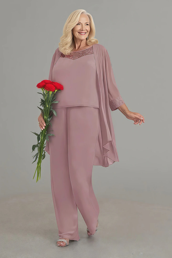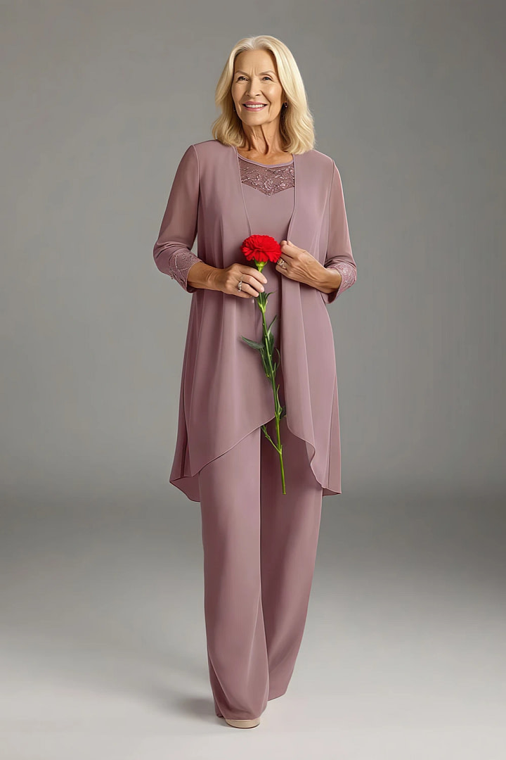 Meet the Akaks Adriana mother of the groom dresses dusty rose pant suits—a soft, romantic ode to motherhood, designed to make you glow on your child’s special day. Crafted in a dreamy dusty rose hue, this three-piece ensemble blends delicate details with understated luxury, ensuring you feel confident and cherished from the first toast to the final dance.