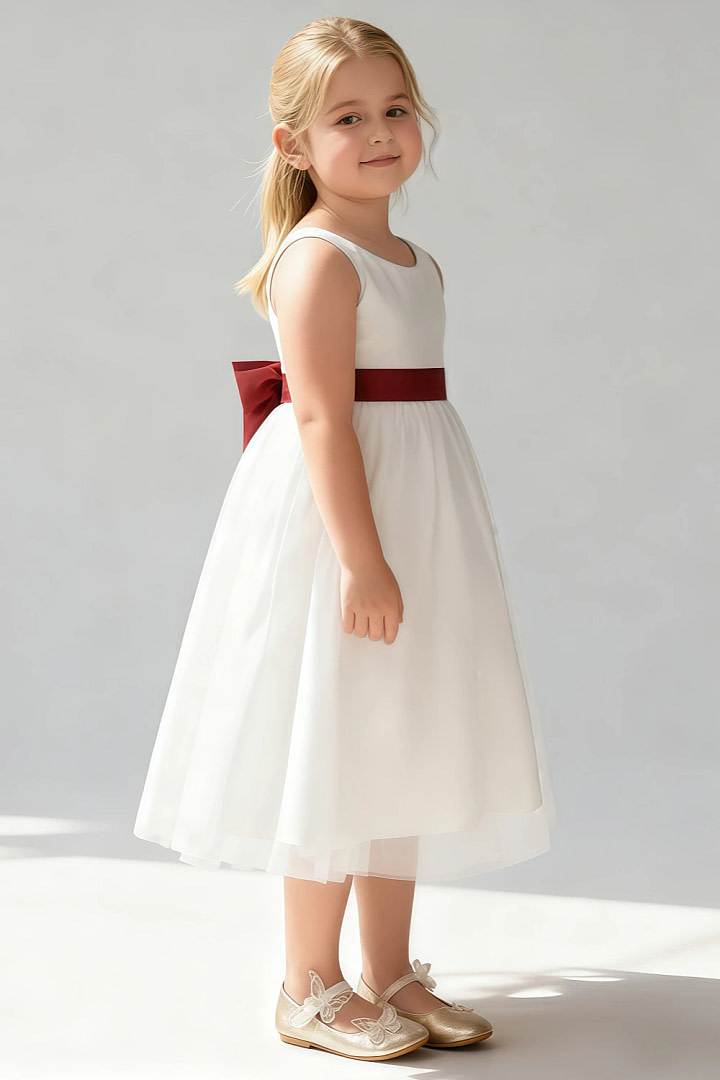 Our A-line silhouette is a crowd-pleaser, designed to flatter all body types—gentle curves, slim frames, or playful shapes, it skims elegantly without clinging. The upper half features luxe matte satin, offering a smooth, lustrous finish that catches light beautifully, while the lower half flows with ethereal tulle, creating a dreamy, lightweight movement. This blend of textures makes it a versatile a line satin flower girl dress for both formal weddings and casual outdoor gatherings.