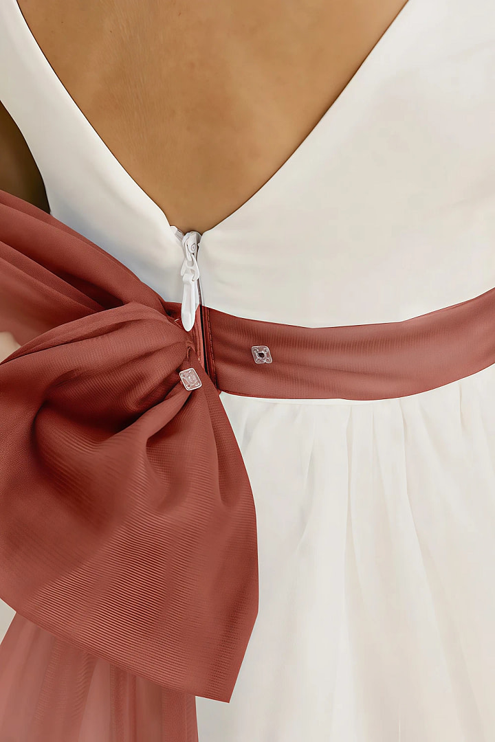 - Whimsical Back Details: The V-shaped open-back, secured with a YKK zipper, adds a modern twist, while a large, detachable tulle bow brings playful charm—easily removable for a softer, more understated style.