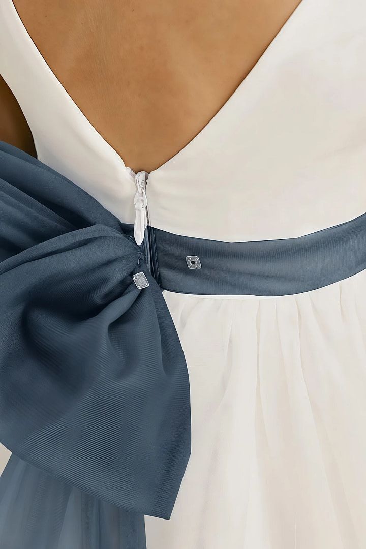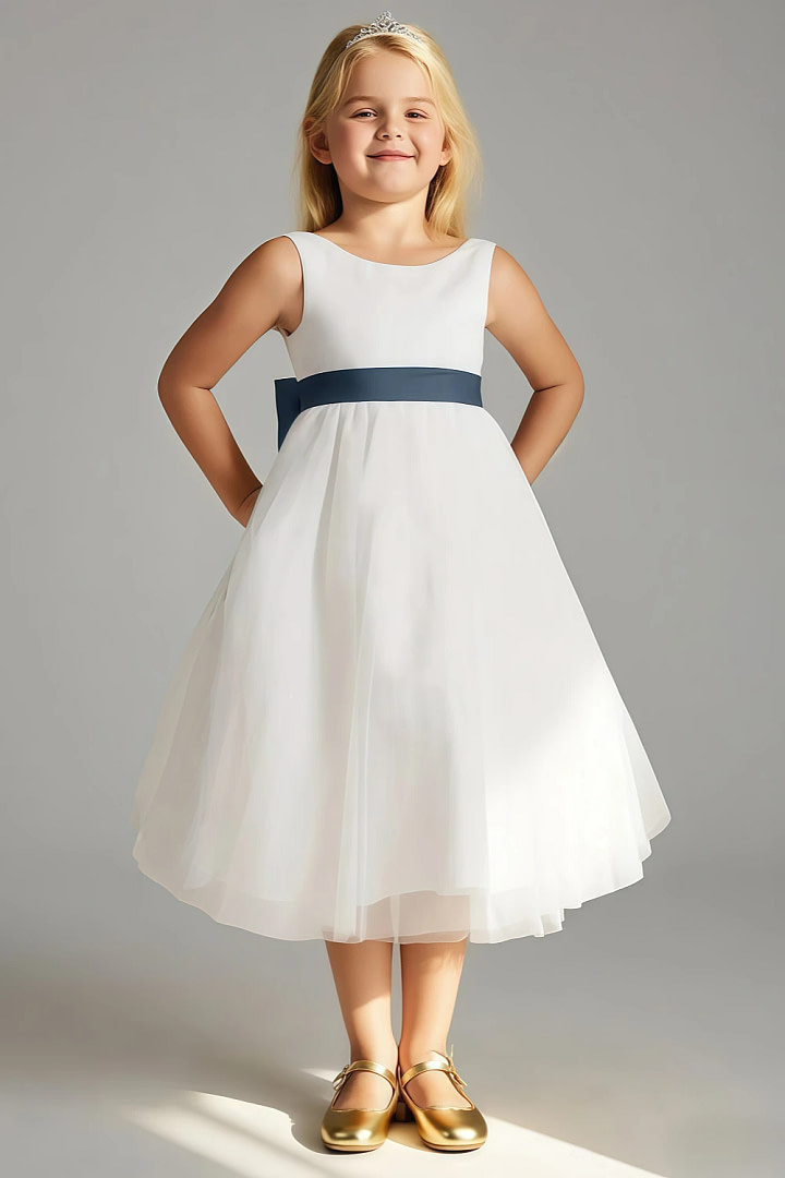 Designed to capture the magic of childhood, the Akaks Blythe Dress combines timeless elegance with playful charm. This A-line flower girl dress features a sleek matte satin bodice and a soft, multi-layer tulle skirt that floats with every movement. The sleeveless scoop neckline ensures comfort and freedom, while the low V-back with a hidden YKK zipper offers a secure yet graceful fit. Accented with a delicate sash and a dramatic detachable bow, this dress allows effortless style transitions—from classic to whimsical in an instant.