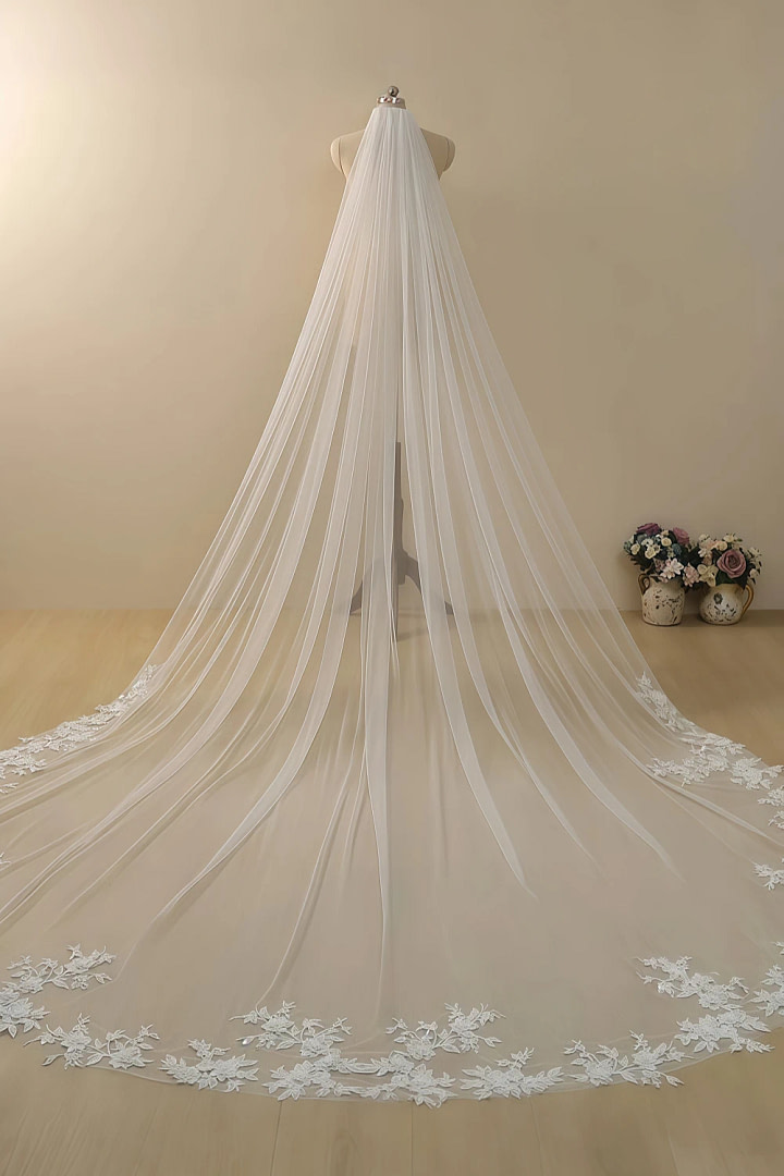- Intricate Floral Lace Appliqué: The edge is adorned with delicate, high-quality lace featuring detailed floral and vine motifs. This lace wedding veil detail adds a touch of dimensional artistry and romantic texture, beautifully framing your figure.