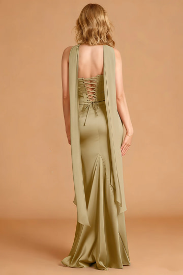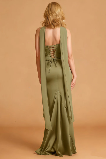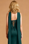 This pine green bridesmaid dress is perfect for a range of formal events, including weddings (as a bridesmaid or guest), proms, galas, and cocktail parties. For a cohesive look, pair it with metallic accessories such as pearl earrings, a delicate necklace, and strappy heels in silver or gold. A matching clutch bag complements the ensemble, while an updo hairstyle highlights the convertible neckline. For cooler weather, the chiffon scarf can be draped over the shoulders for added warmth and sophistication. This versatile gown also transitions well from daytime ceremonies to evening receptions, making it a wardrobe staple for multiple occasions.