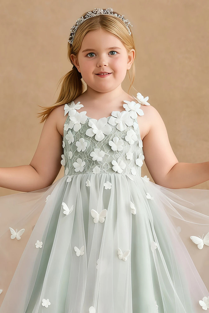 Crafted for little dreamers, the Akaks Eira agave green flower girl dress shines in a refreshing agave green hue—bright yet gentle, like new leaves unfurling in spring. Its A-Line/Princess silhouette flatters toddlers to young girls (sizes 2–14), with an asymmetrical hem that skips playfully above the knees in front and cascades into a floor-sweeping tulle train at the back. The sleeveless V-neck bodice, crafted from buttery-soft lace, is hand-embroidered with tiny white flowers, each petal and leaf placed with meticulous care (no two dresses are identical!). A sweet agave-green satin bow crowns the back, while layers of sheer tulle—sprinkled with matching white blossoms—add movement and magic with every twirl.