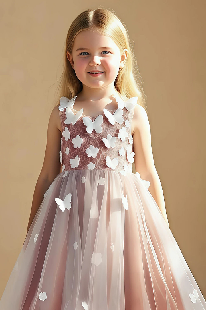 The skirt is where magic meets movement: layers of tulle create a dreamy, ethereal silhouette. The hemline, asymmetrical and playful, features a knee-length front (perfect for showcasing dainty white-piped shoes) and a longer, flowing back (draped in gradient tulle, blending soft pink to paprika) that dances with every step. Delicate white flowers are scattered across the tulle, mirroring the bodice’s botanical details, while a bold, paprika silk bow sits at the back, its full, billowy shape echoing the dress’s lively spirit.