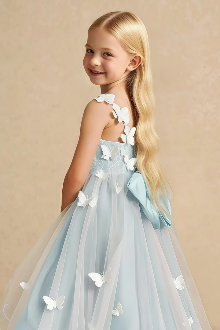 The lace-adorned bodice is embellished with meticulously hand-sewn 3D flowers and butterflies, each arranged with artistic variation for a truly unique look. A statement back bow adds a playful yet polished finish, while layers of soft tulle create a lightweight, floating effect perfect for twirling and celebration.