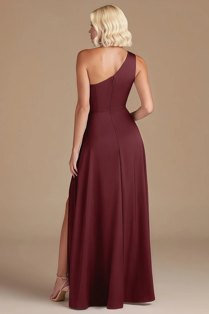 Crafted from luxurious satin with a rich cabernet hue, this floor-length bridesmaid dress combines sophistication with comfort. Its A-line silhouette gracefully skims the body, flattering every figure—whether curvy, straight, or apple-shaped. The one-shoulder design adds a touch of asymmetrical allure, while the high slit ensures ease of movement and a hint of glamour.